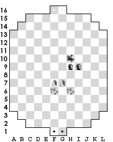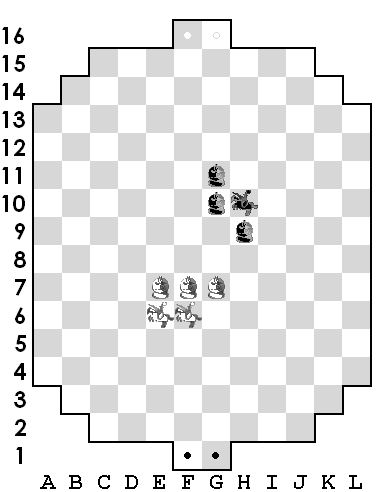 6....C11-E9? Black misses his chance to win a Man and equalize with the very complicated 6....F10-F8!!, 7.G8xE8 D10-F10-H8xF6xF8xD8xF6, 8.H6-H8xF10xF12xD10xF10xH12xJ10 F6xH6xJ6xH8xH6, 9.J8-I7! H6xJ8, 10.J10-I9! H10-G11!, 11.I9xK7 F9-E8!, 12.D7xF9 G10xE8. With the fireworks over, White would have had two Knights and one Man, Black one Knight and three Men: a small (though probably not winning) advantage for Black!